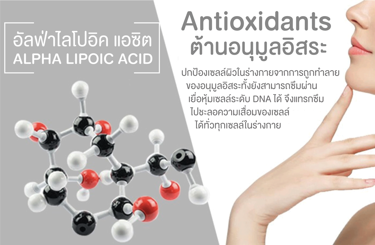 ผลิตภัณฑ์ที่มีส่วนผสมของ Alpha Lipolic Acid ที่มีศักยภาพในการต้านอนุมูลอิสระในความเข้มข้นสูง ช่วยลดเลือนริ้วรอยแห่งวัย และผลัดเซลล์ผิว เพื่อให้สีผิวแลดูกระจ่างใส นุ่มเนียน สม่ำเสมอ ดูอ่อนยาว์